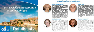 ![]() | Inscrivez vous dès maintenant à la prochaine croisière maçonnique du 12 au 19 novembre 2017 Aurélie GARRIGUES est l’interlocutrice dédiée à notre croisière. Elle saura répondre à vos questions et vous conseiller. Prenez contact directement avec elle : – Ligne directe: 00 33 1 55 47 55 79 – Mail : garrigues@fr.costa.it |
